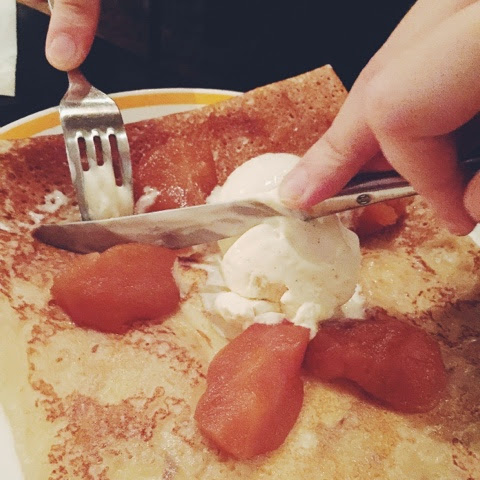 品嚐完鹹Crêpe當然要吃甜Crêpe。因為男朋友是法國人所以還是由他作主意,畢竟吃中國菜就是要問中國人,日本菜就是要問日本人,現在我們吃Crêpe問法國人準沒錯,甜Crêpe和鹹Crêpe在製作上都是不同的,鹹可麗餅在製作餅皮的同時便加入了像是乳酪、火腿、雞蛋等各式可能的配料烹調;甜Crêpe則是在餅皮製作完成後才做裝飾。男人說他在法國常吃64號的Les Voiles De St Tropez, 就是焦糖蘋果配搭香草冰淇淋。香甜的焦糖蘋果配合香草冰淇淋,再加上鬆軟的Crêpe,冰火一樣的多重口感實在太美妙了,焦糖蘋果雖偏甜可是和香草冰淇淋混合中和味道卻是多麼的合襯。這個甜點作為完結真的是太完美了。