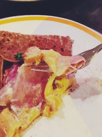 因為在灣仔的分店有不太好的印象,本想對上環的沒有期望,雖然餅皮已經煎得偏硬及過熟,但比起灣仔分店煎得變成餅乾的就差很遠,當然回想起我在巴黎的時候,是十分鬆軟可口,但這次的也叫很不錯。我點了26號的Les Poulains,Crêpe內裡配著French raclette cheese、火腿、熏火腿和馬鈴薯。