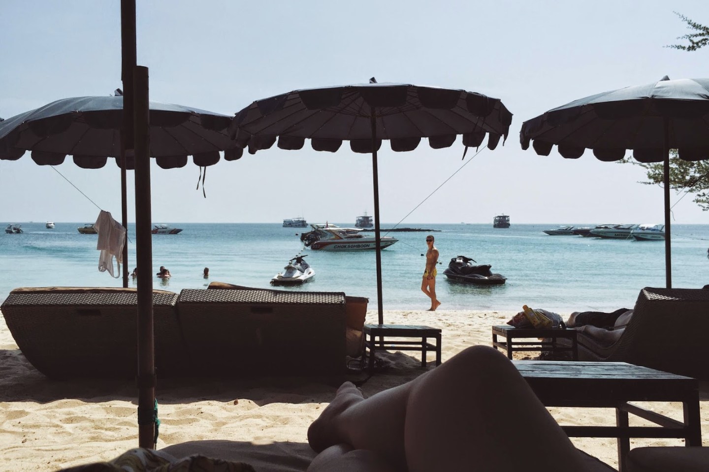 到了小珊瑚島後,如果會騎摩托車,可以租車環島;不然也可以搭當地的小巴(tuk tuk),約20泰銖就能到各大海灘。這天我們選了 Ta Waen Beach。沙質還是一般般,但海水清澈得驚人,還能看到小魚悠游。唯一的缺點就是島上設施基本收費,連上廁所也要10泰銖。
