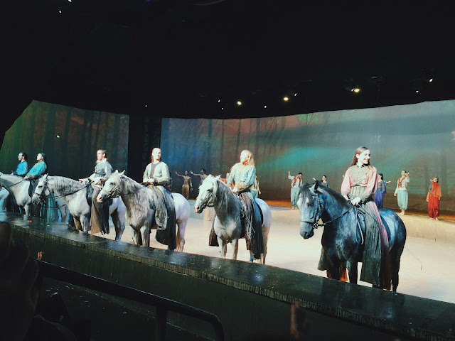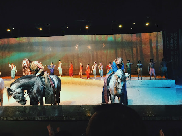 我很配服Cavalia 幾乎都用不同的故事情節穿插馬的表演。也很喜歡他們沒有馬的時候安排一連串空中飛人,後空翻或在馬戲團正常看到的雜技。場景雖然沒有好精緻但是也很美就是,現場令人讚賞的是LIVE BAND! 配樂及主唱也太好聽了吧。完全不像現場表演,和播CD沒有分別呢。