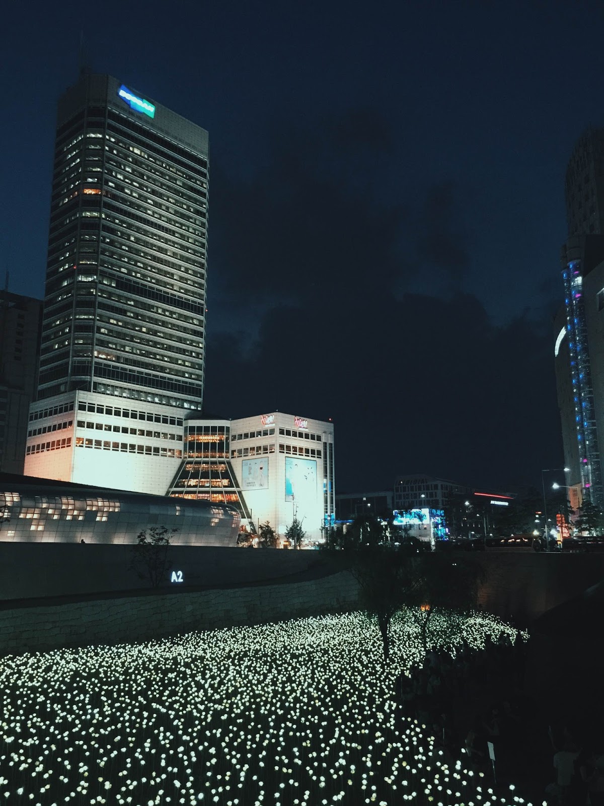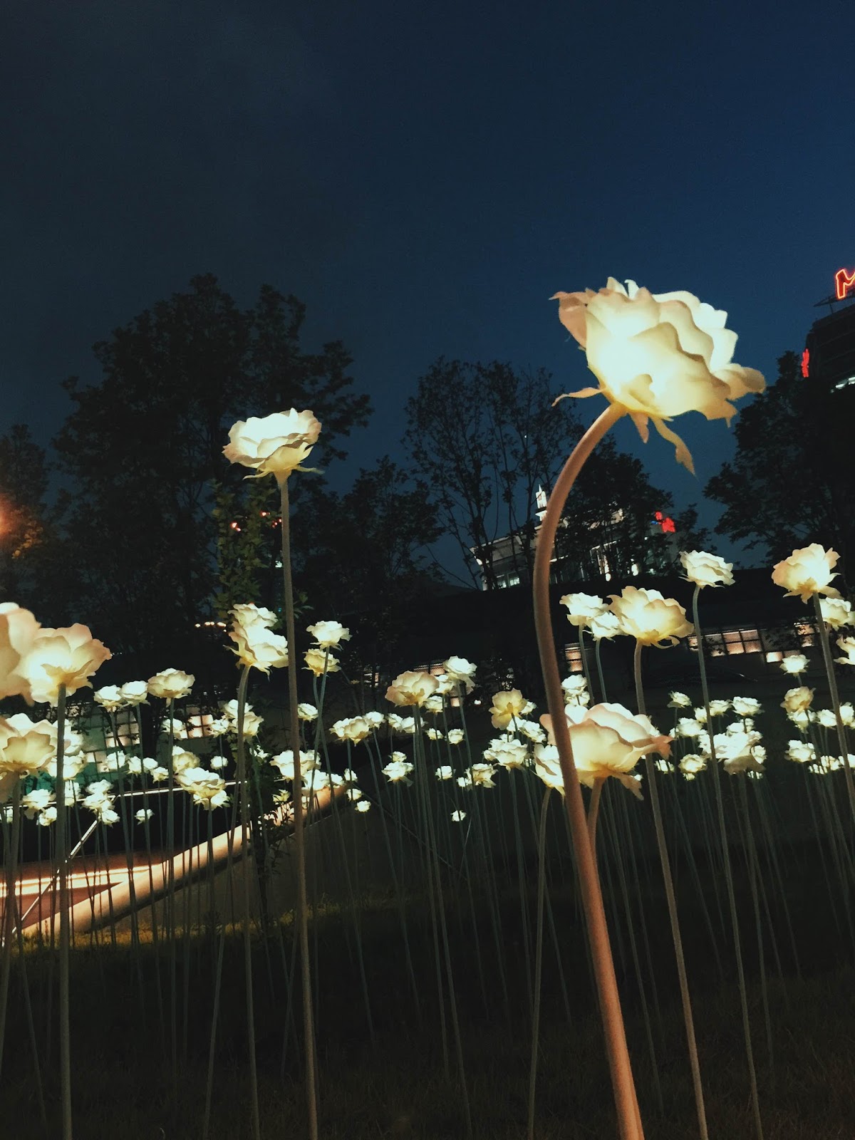 DDP內最吸引我的是夜光花海──一片片裝著燈的小白花,在夜晚柔和綻放,浪漫得不得了。也見到不少情侶在花海裡談心,果然首爾街上的情侶密度超乎想像,高到讓人驚訝。