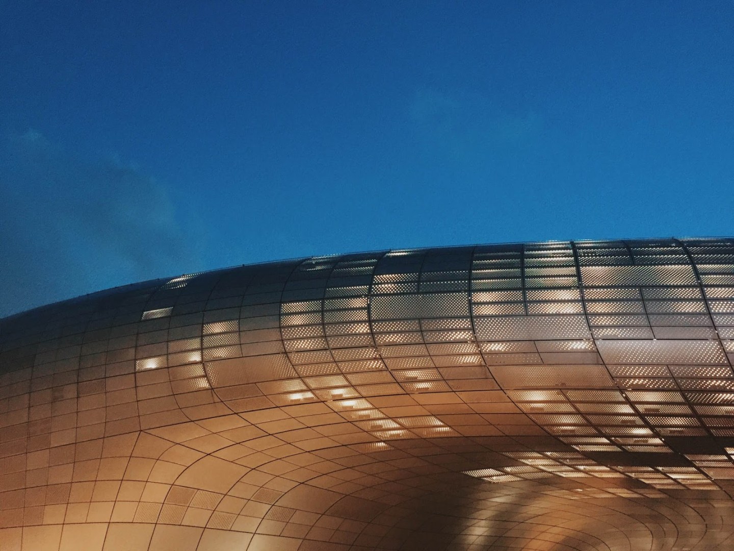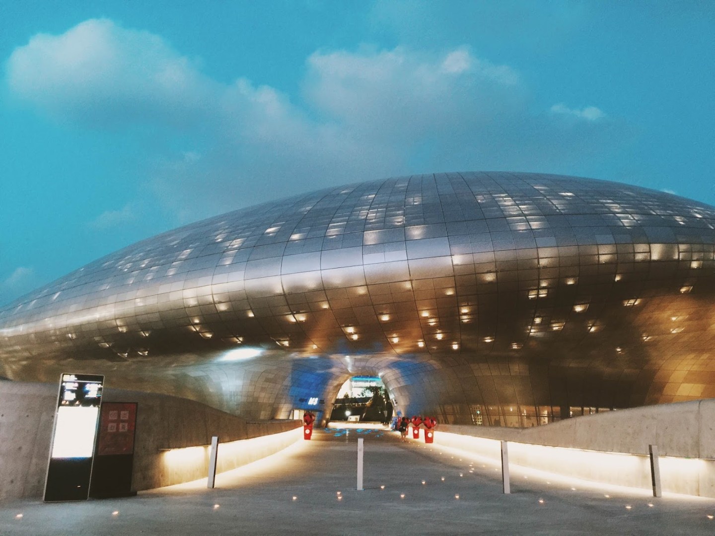 韓國夏季入夜很晚,要到晚上八點半之後天才完全黑。當燈光亮起,眼前的DDP建築猶如一艘未來感十足的巨型UFO,由建築大師扎哈·哈迪德設計,冰冷的流線金屬感非常震撼。
