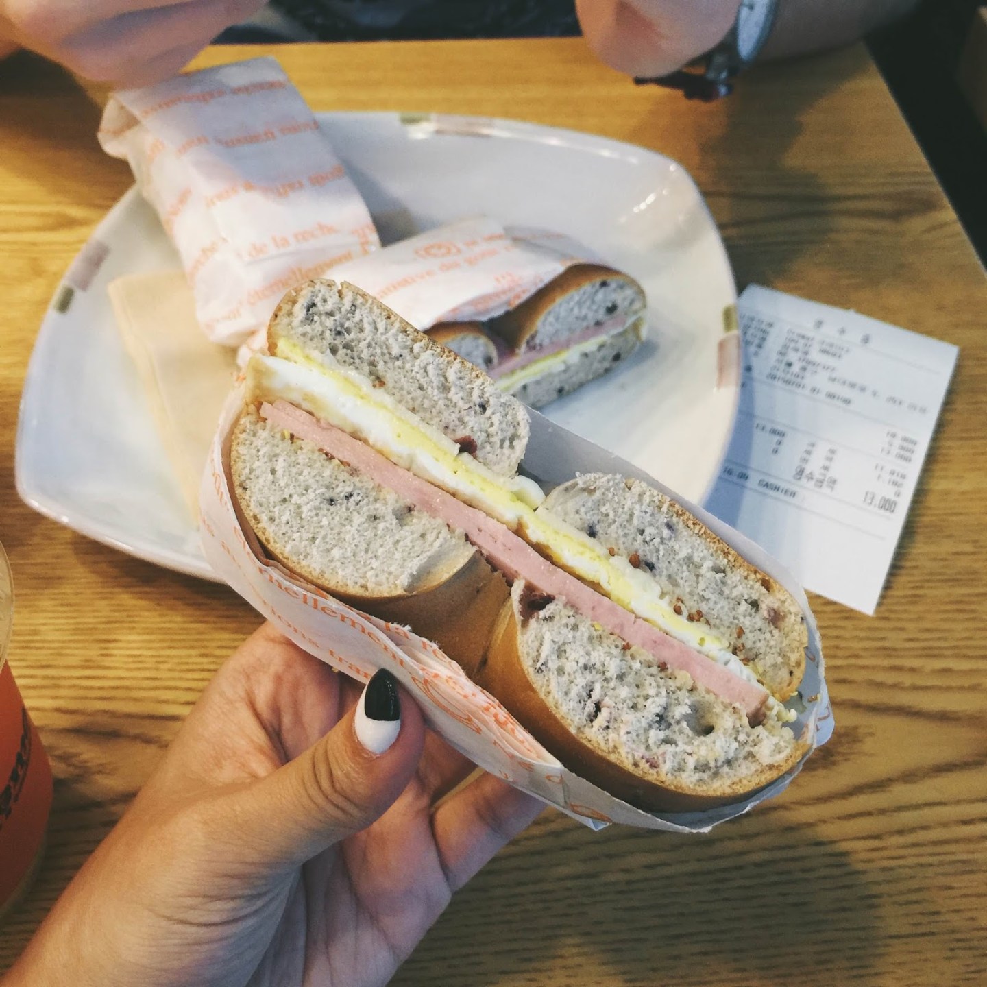 第一頓正餐出乎意料地是西餐──Bagel。因為午市時間已過,餐廳休息中,一路上滿滿烤肉香卻找不到地方進去吃,最後只好選了家小小的Cafe。韓國人的英文真的不太行,點餐也結結巴巴的,不過總算順利完成。Bagel 烘得暖暖軟軟,夾著芥末醬、芝士和火腿,意外地好吃。沒想到,連韓國人做西餐也這麼有水準。這家小店叫 The Creme (2025年查了一下,好像還有營業喔。)