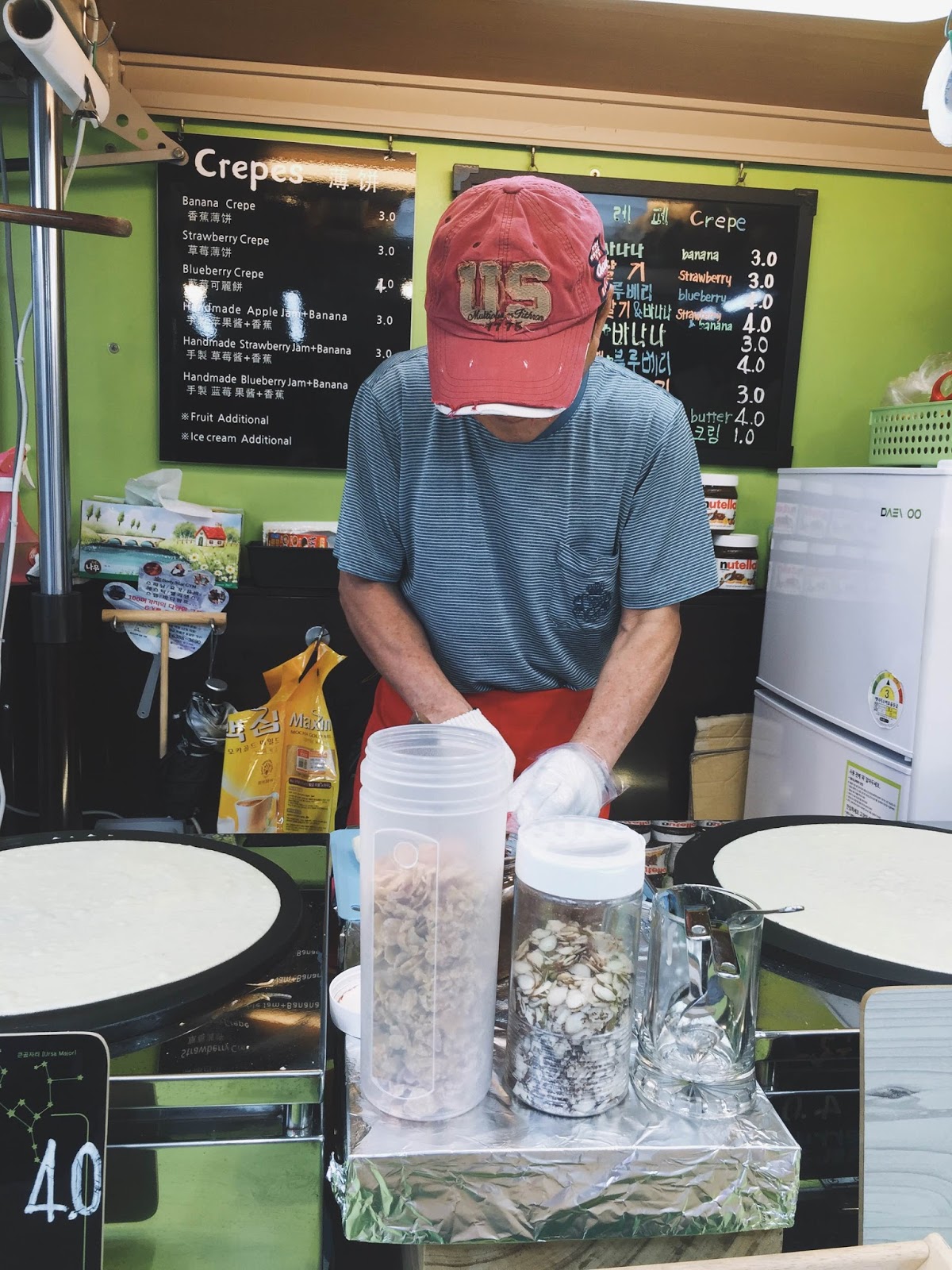 在附近晃到Migliore旁邊小吃攤,發現了一個韓國大叔在賣Crepe。