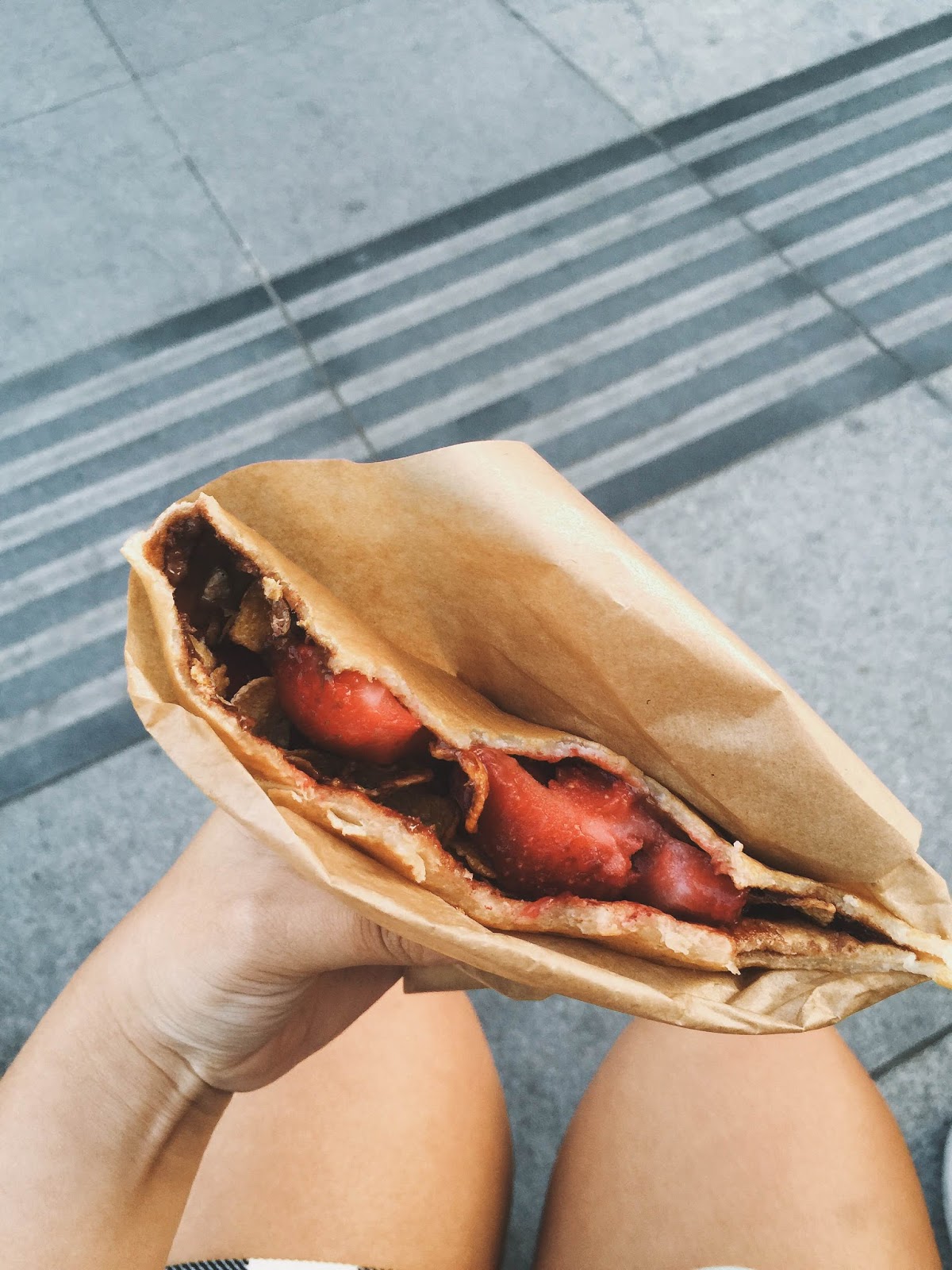 雖然冰凍草莓一開始有點出戲,但吃起來真的超好吃!一邊是冷得透心涼的草莓,一邊是熱呼呼軟軟的Crepe,第一次真正體會到所謂「冰火五重天」的滋味。