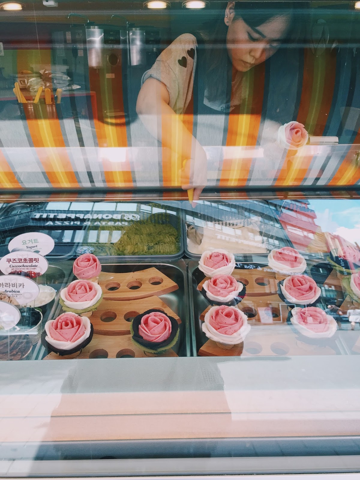 結束北村的散步後,我們回到明洞隨意吃了午餐,也在街上找到了人氣很高的「花兒雪糕」。乳酪雪糕用不同口味層層疊出花瓣造型,酸酸甜甜的味道,加上漂亮的外觀,果然很受歡迎。不過雪糕融化得很快,吃到手黏黏的也是小小挑戰(笑)。
