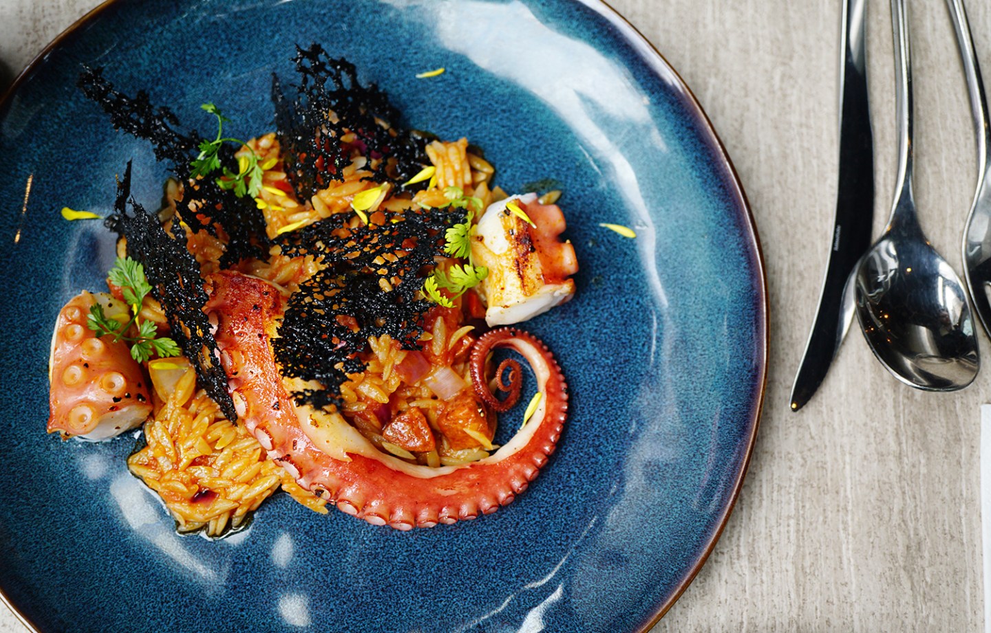 若果ATUM是以藝術甜點起家,食物裝盤的技術水平絕不能疏忽視,十分吸晴而且精緻得很,他們的菜式的名字真的十分簡單直接,這道叫「Octopus」的料理,大大的標誌就是一條很大很大的章魚腿,整道菜的顏色十分鮮豔奪目,為橙紅色做主題,伴些小黃菊的花瓣,還沒有吃下去,都已經強烈感受到這道菜的整體味道了。