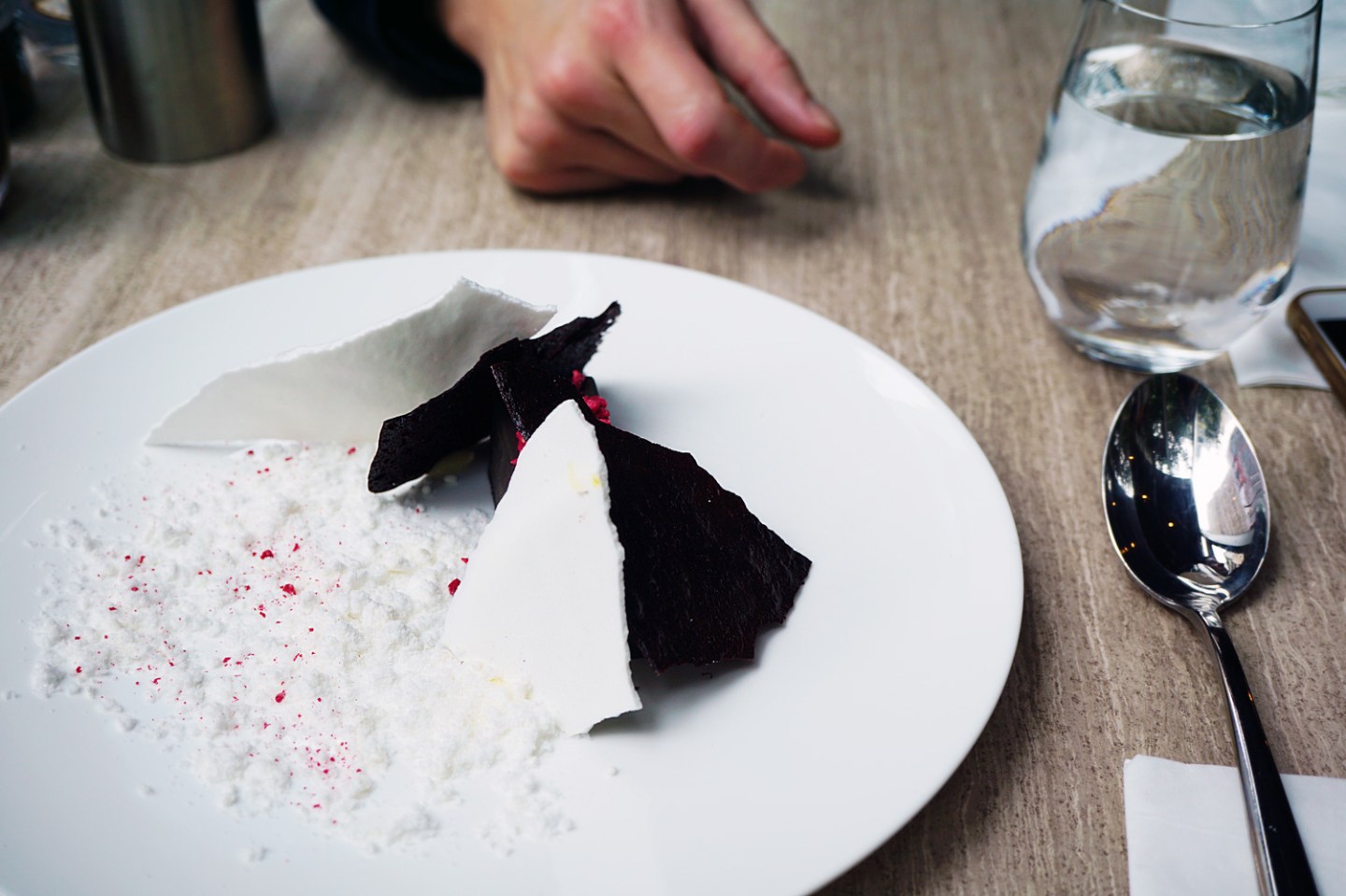 到了最後當然是要有甜品來做一個收尾了,當天點了這個我又是失望多於喜歡,當然外觀還是一樣的漂亮,一樣的新穎特出,但味道我個人覺得有點強差人意,Chocolate Marquise,因為是80%的濃度,甜味不太強,但White Chocolate powder卻完全不能增強或為整個Marquise調味,反而紅莓碎十分出色,幾乎搶下整道甜點的主體味道。烤過的朱古力片口感十分脆身,有點像吃玉米片的感覺。