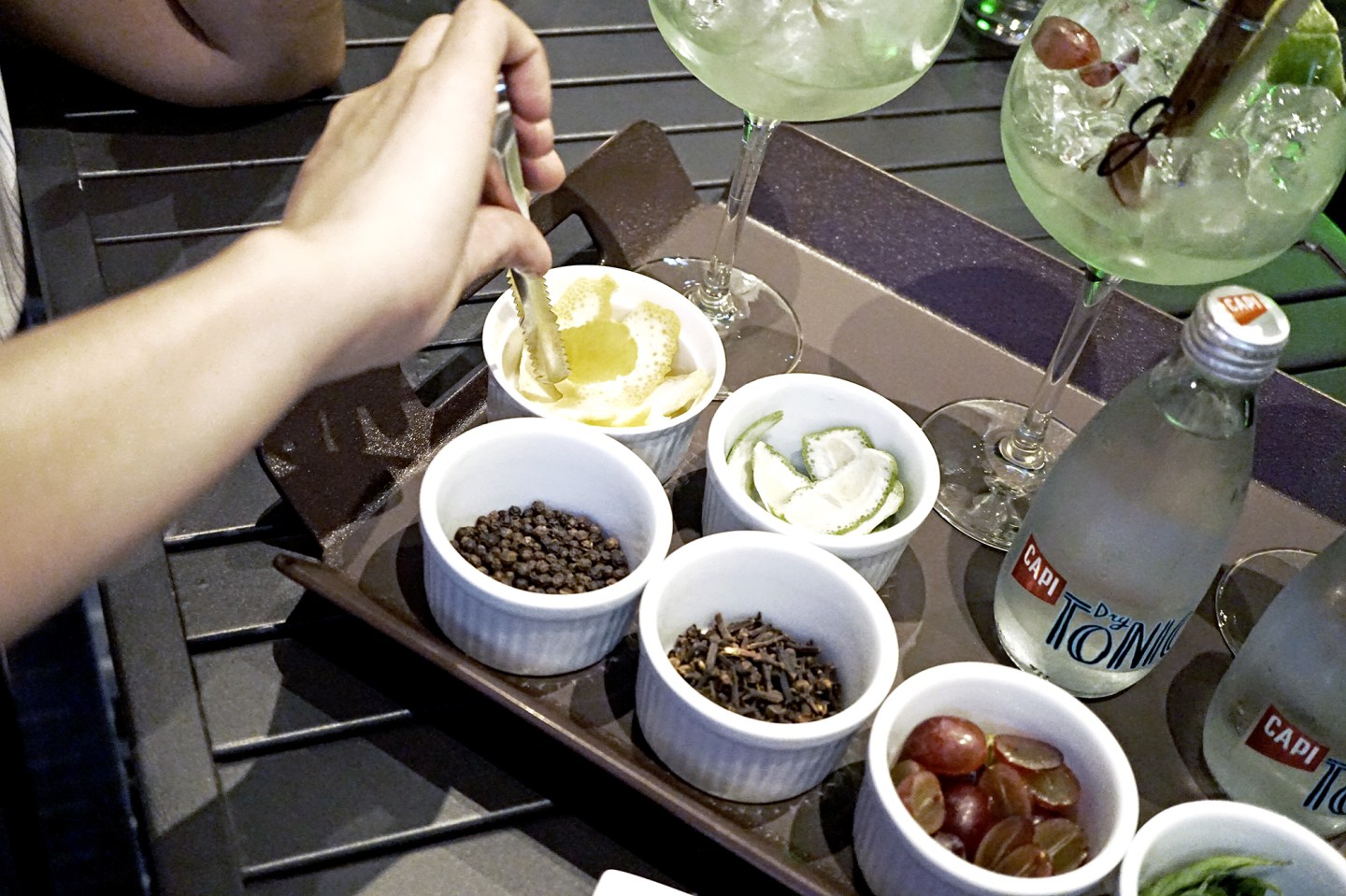 我個人覺得Gin n Tonic 其實是一杯很陽剛的cocktail,大部分年輕的女孩很多都不會喜歡Gin n Tonic, 因為這杯酒帶點苦澀味而且通常配著檸檬,是有點酸,但我自從過了25歲的生日後,又被這個社會洗禮,反而開始喜歡這苦澀的味道,自我安慰自己是吃得苦,也覺得自己的人生好像Gin n Tonic, 酸酸的苦苦的,不過俗話說,吃得苦中苦,方為人上人啊。除了口口花香外,最有趣的就是Chez Patrick Deli serve 這個gin 的模式也大大不同,就是可以用不同的配料調配合自己口味的GnT了。想帶點辛辣? 放些黑椒吧。想清甜? 放葡萄就對。