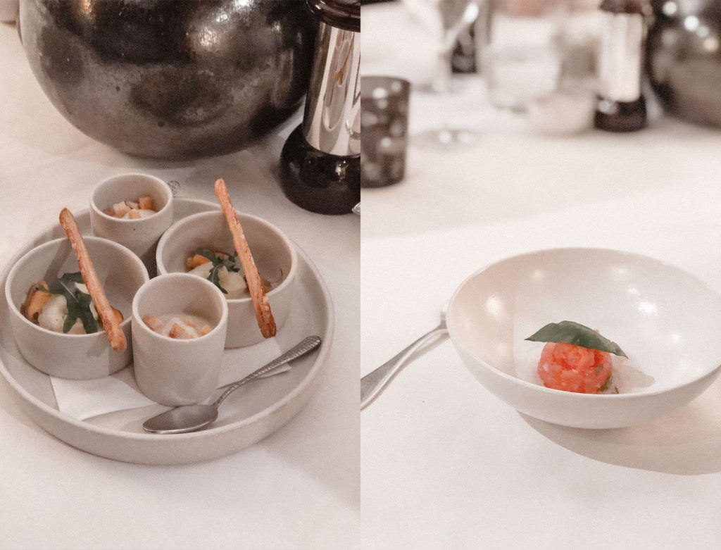 Pave d’Auge外身以傳統諾曼第小木屋為主要外觀,內裡也是保持傳統架構及傳統裝潢,但是擺設及食具卻十分的有現代風。很多的碗子美得我也想收藏呢。我們8人全都點了 65€ sans le fromage 套餐(這包含前菜,主菜,甜點卻不含芝士)心想3碟不多不小應該剛剛好了吧,反正米其林份量通常都不多。不過不知道因為地區問題還是大廚慷慨,其實全餐有三道菜是不在餐單裡面,分別就是頭盤及甜點會額外有多一兩盤。我想這個額外的菜式是不固定,但其他菜式則固定的。