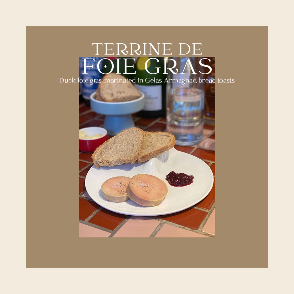 - TERRINE DE FOIE GRAS (Duck foie gras, marinated in Gelas Armagnac, bread toasts)